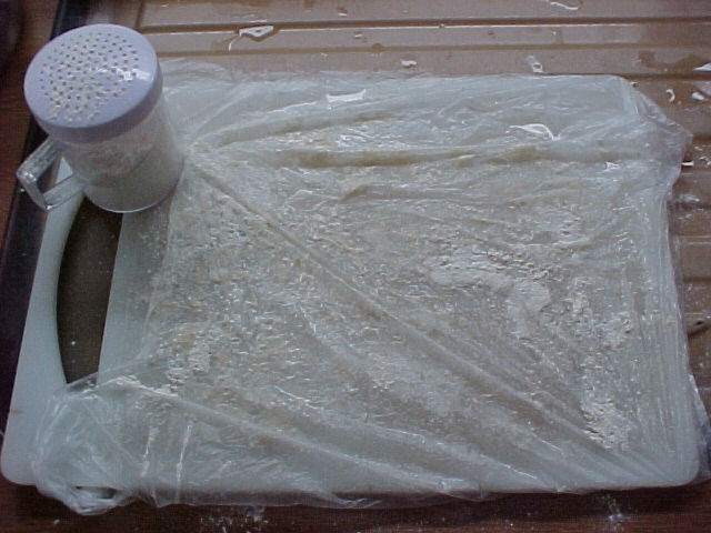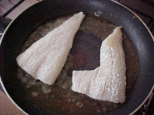 So on to next weeks chish & fips. No fresh fish this week as I sold all of my stock this afternoon so Mum fished some out of the freezer. Pour a little oil in a large frying pan and heat up to temperature on a medium gas flame while you flour the fillets. A sheet of paper or poly bag is useful for keeping things tidy, just rinse each portion under cold water then sprinkle flour on both sides to stop it sticking to the frying pan otherwise it would break up as you try to move it..